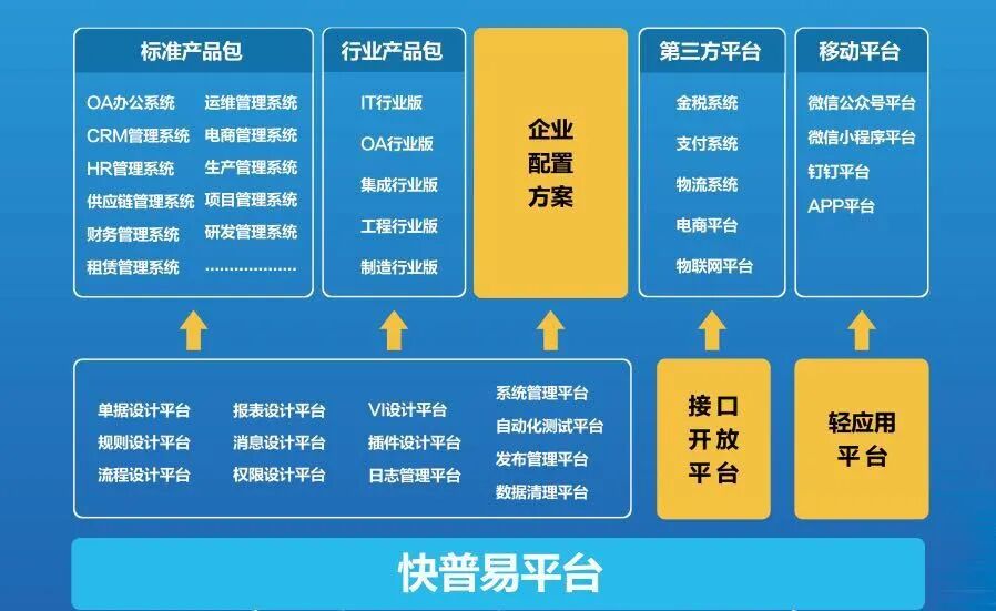 易平台是快普的第三代战略产品,将软件平台化,简单、易用,实现“零代码开发”,让普通用户像使用office一样简单,利用平台自助配置个性需求,以不变应万变。